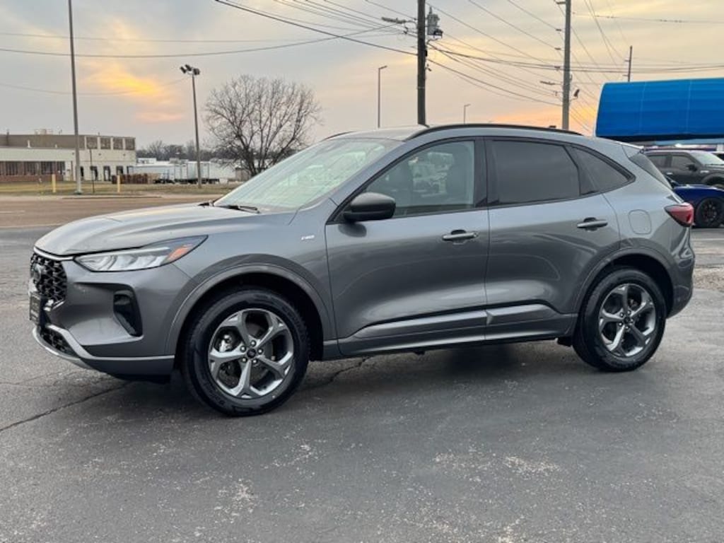CARFAX One-Owner. Clean CARFAX. Gray Metallic 2024 Ford Escape ST-Line AWD 8-Speed Automatic 1.5L EcoBoost Cold Weather Package, Equipment Group 300A, Exterior Parking Camera Rear, Heated Front Row Seats, Heated Sideview Mirrors, Heated Steering Wheel, Power Liftgate, Remote Starter System, 3.81 Axle Ratio, 4-Wheel Disc Brakes, 6 Speakers, ABS brakes, Air Conditioning, Alloy wheels, AM/FM radio: SiriusXM, AM/FM Stereo, Auto High-beam Headlights, Automatic temperature control, Brake assist, Bumpers: body-color, Compass, Delay-off headlights, Driver door bin, Driver vanity mirror, Dual front impact airbags, Dual front side impact airbags, Electronic Stability Control, Emergency communication system: SYNC 4 911 Assist, FordPass Connect, Four wheel independent suspension, Front anti-roll bar, Front Bucket Seats, Front Center Armrest, Front dual zone A/C, Front License Plate Bracket, Front reading lights, Fully automatic headlights, Illuminated entry, Knee airbag, Low tire pressure warning, Occupant sensing airbag, Outside temperature display, Overhead airbag, Overhead console, Panic alarm, Passenger door bin, Passenger vanity mirror, Power door mirrors, Power driver seat, Power steering, Power windows, Radio data system, Rear anti-roll bar, Rear reading lights, Rear seat center armrest, Rear window defroster, Rear window wiper, Remote keyless entry, Roof rack: rails only, Speed control, Speed-sensing steering, Speed-Sensitive Wipers, Split folding rear seat, Spoiler, Sport steering wheel, Steering wheel mounted audio controls, SYNC 4, Tachometer, Telescoping steering wheel, Tilt steering wheel, Traction control, Trip computer, Variably intermittent wipers, Vinyl/Cloth Front Sport Contour Bucket Seats, Wheels: 18" Rock Metallic Painted Aluminum, Cold Weather Package, Equipment Group 300A, Exterior Parking Camera Rear, Heated Front Row Seats, Heated Sideview Mirrors, Heated Steering Wheel, Power Liftgate, Remote Starter System.