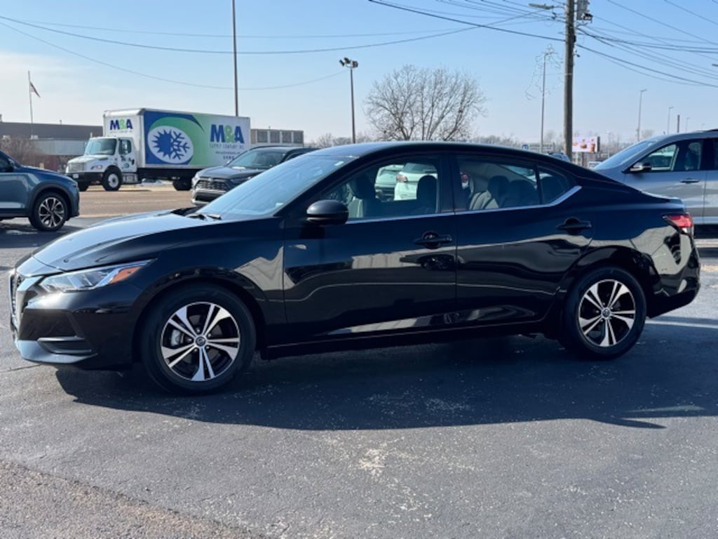 CARFAX One-Owner. Clean CARFAX. Super Black 2022 Nissan Sentra SV FWD CVT with Xtronic 2.0L DOHC NissanConnect featuring Apple CarPlay and Android Auto, 16" Alloy Wheels, 4-Wheel Disc Brakes, 6 Speakers, ABS brakes, Air Conditioning, Alloy wheels, AM/FM radio: SiriusXM, Auto High-beam Headlights, Blind Spot Warning, Brake assist, Bumpers: body-color, Carpeted Floor Mats w/Trunk Mat, Clear Rear Bumper Protector, Delay-off headlights, Door Sill Plates, Driver door bin, Driver vanity mirror, Dual front impact airbags, Dual front side impact airbags, Electronic Stability Control, Four wheel independent suspension, Front anti-roll bar, Front Bucket Seats, Front Center Armrest, Front reading lights, Fully automatic headlights, Heated door mirrors, Hide-A-Way Trunk Net, Illuminated entry, Knee airbag, Low tire pressure warning, Occupant sensing airbag, Outside temperature display, Overhead airbag, Overhead console, Panic alarm, Passenger door bin, Passenger vanity mirror, Power door mirrors, Power steering, Power windows, Premium Cloth Seat Trim, Radio data system, Radio: AM/FM w/RDS/MP3/Aux-In, Rear anti-roll bar, Rear Parking Sensors, Rear seat center armrest, Rear side impact airbag, Rear window defroster, Remote keyless entry, Security system, Speed control, Speed-sensing steering, Split folding rear seat, Steering wheel mounted audio controls, Tachometer, Telescoping steering wheel, Tilt steering wheel, Traction control, Trip computer, Trunk Package, Variably intermittent wipers, NissanConnect featuring Apple CarPlay and Android Auto.